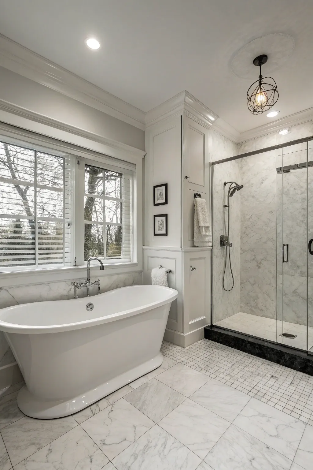 Combining a traditional detached soaking tub with modern shower fixtures can create a classic yet contemporary look. I think this mix is a great way to bring balance to any bathroom design.