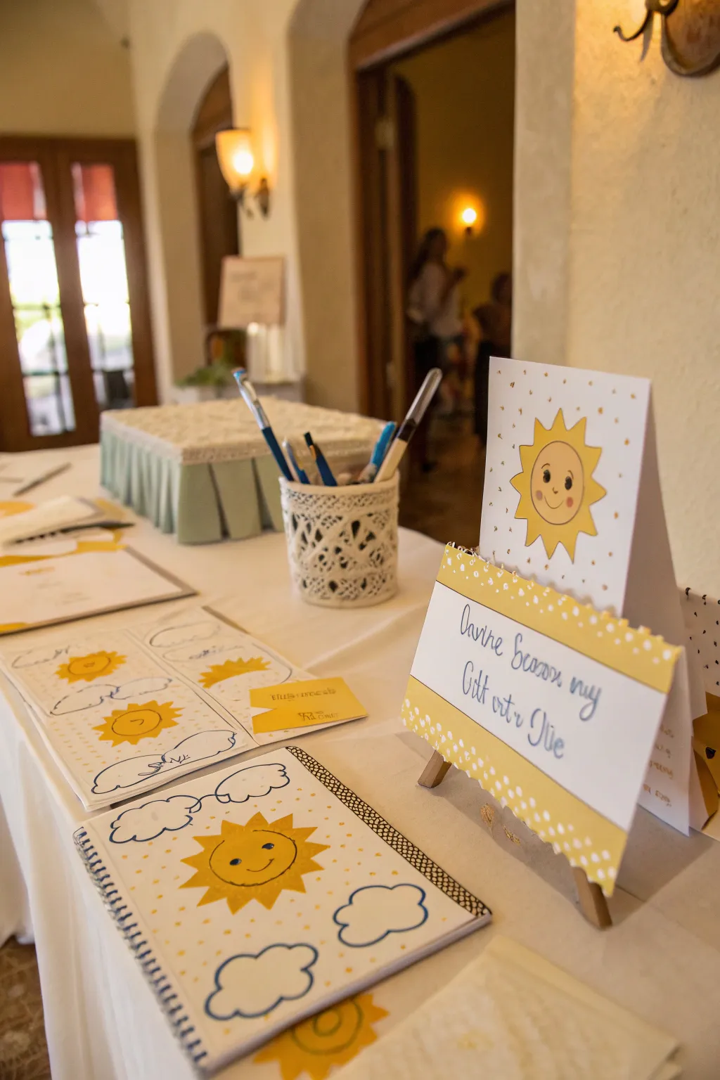 Make a ‘Sunshine Thoughts’ space where attendees can write sweet messages or advice on sun-shaped cards for the parents-to-be. It’s a keepsake idea that adds such a personal touch to the day.