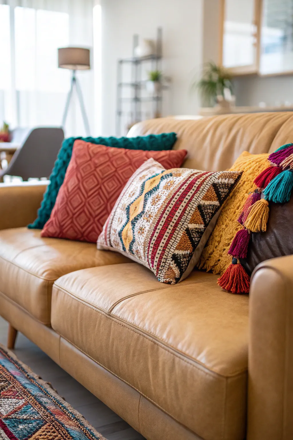 Blend matching materials like linen or velvet with your hide couch for a tactile experience. I appreciate how layering improves both coziness and visual charm.