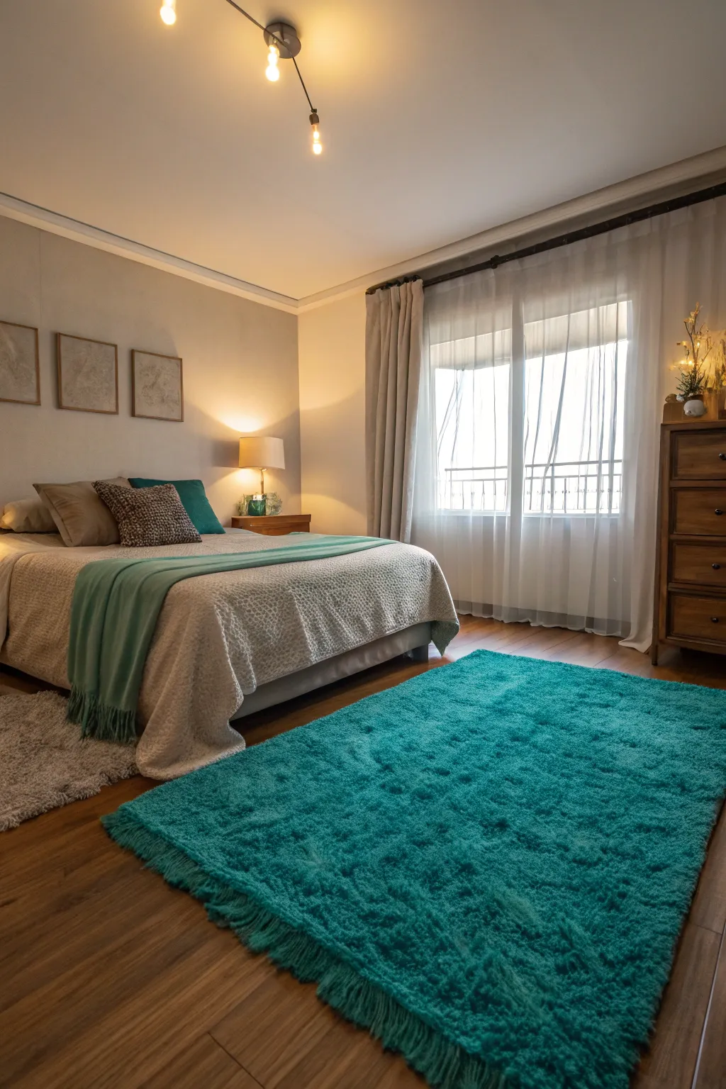 • See-Through Turquoise Drapes: Illuminate your room with see-through turquoise drapes that allow sunlight to enhance teal hues.