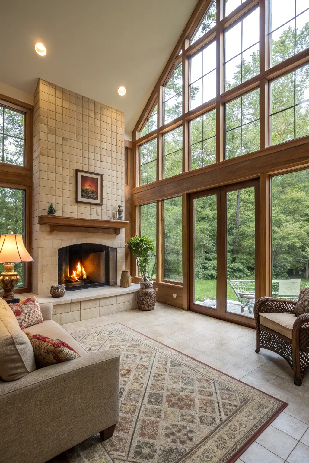 Introduce dimension to your fireplace with intersecting tiles presented in dual shades. This establishes a vibrant and visually stimulating center.