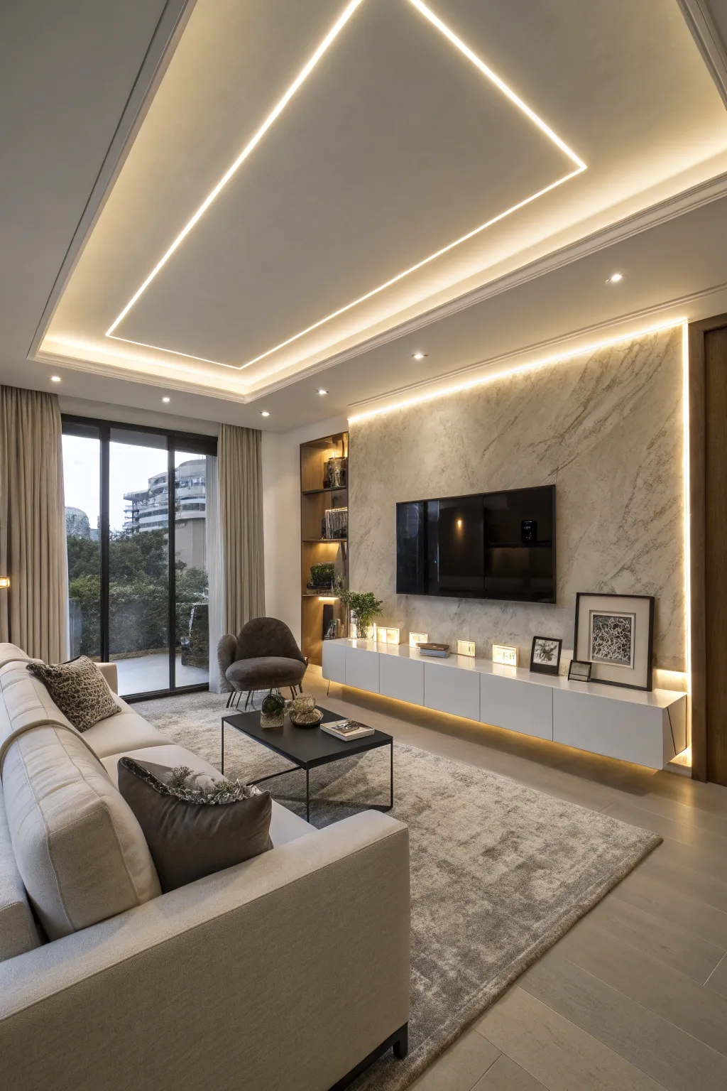 A modern living room using concealed lighting trim for a subtle ambiance.