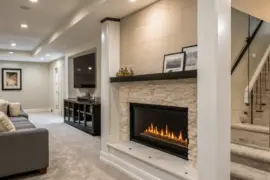 A mock fireplace can bring warmth and charm to your basement TV wall. In one of my designs, the fireplace became a favorite, especially when it got cold outside.