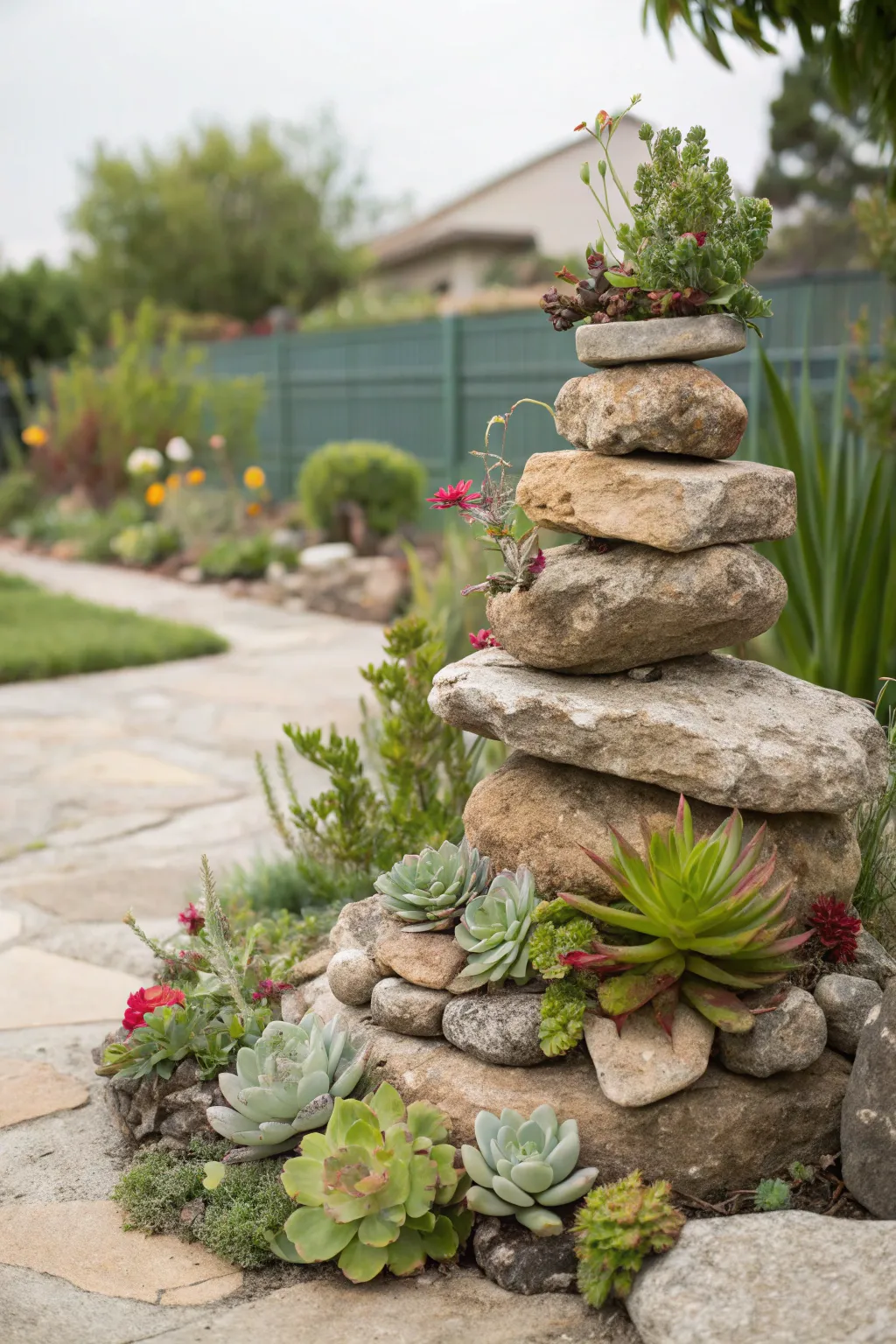 Employ piled stones to devise a multi-layered succulent vessel. This notion is exemplary for sculpting altitude and drama within your garden or veranda.