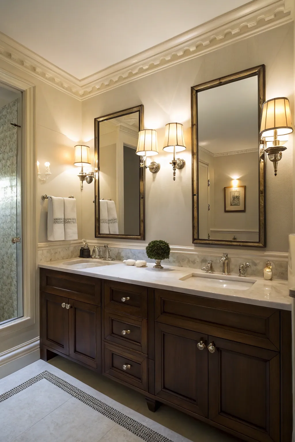 • Decorated Vanity Mirror Duet: Enhance your vanity with a sophisticated mirror set, perfect for a two-sink setup.
