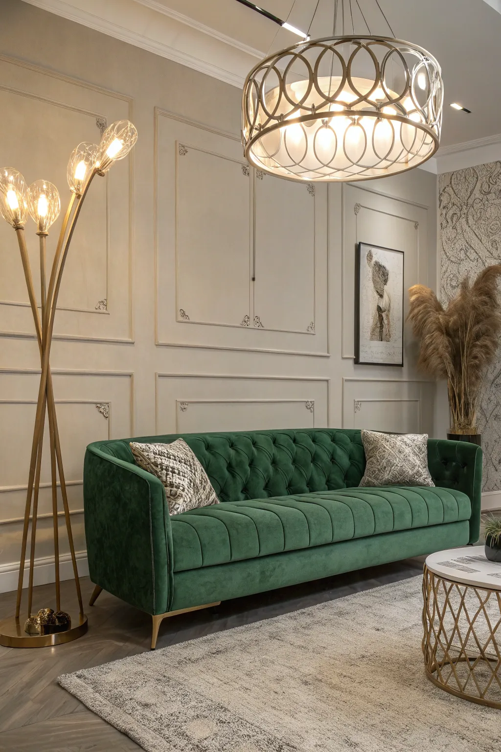 - Contemporary Chandelier: Elevate your decor with a contemporary chandelier, making your verdant plush settee the focal point.