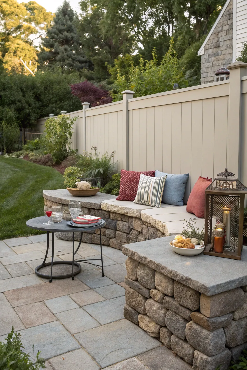Amplify your space with integrated seating along your wall, conceiving a snug corner for social events. My stone wall serves a dual purpose as seating during BBQs, rendering it both a practical and fashionable element.