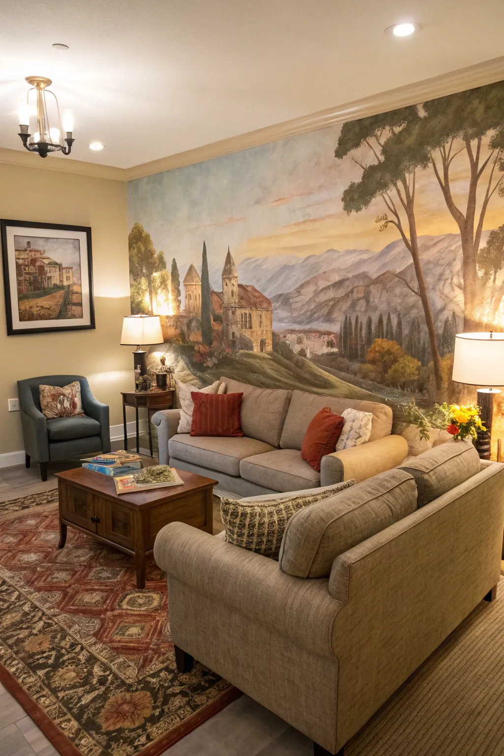 Transform your walls into works of art with wall murals. My favorite is a mural that extends across the entire living room wall, transforming it into a spectacular feature.