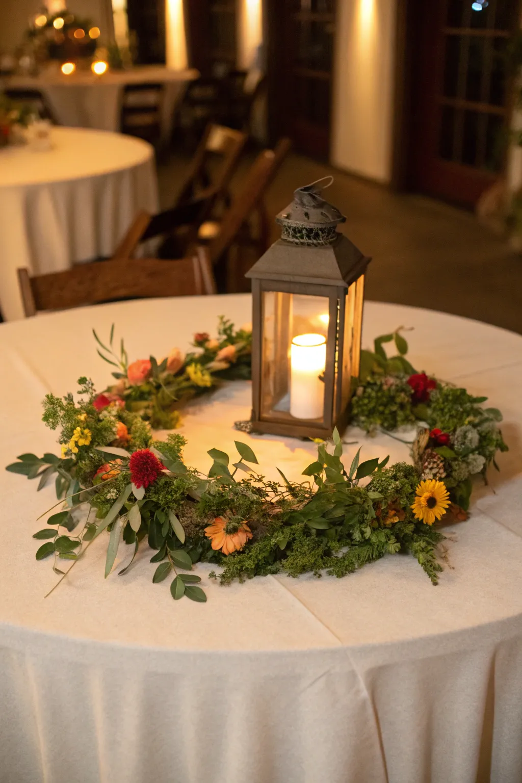 Craft a foliage ring with a lamp at the center for an imaginative feel. This forms a focal point that captures everyone’s eye.