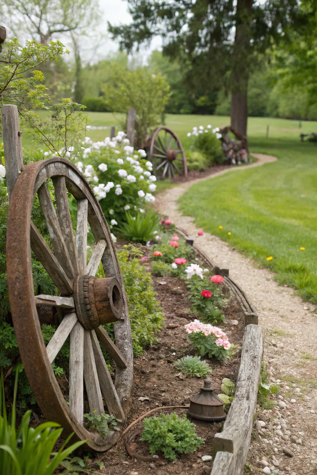 - Country Cart Wheel Décor: Adorn your pathway’s entrance with classic cart wheels, adding traditional rural allure.