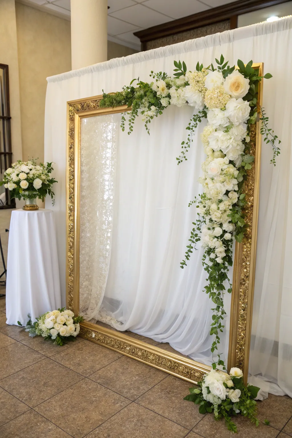 Construct a photo booth with a gold outline and white flowers for a beautiful scene. It’s a delightful and memorable way for your guests to capture the day’s enchantment.