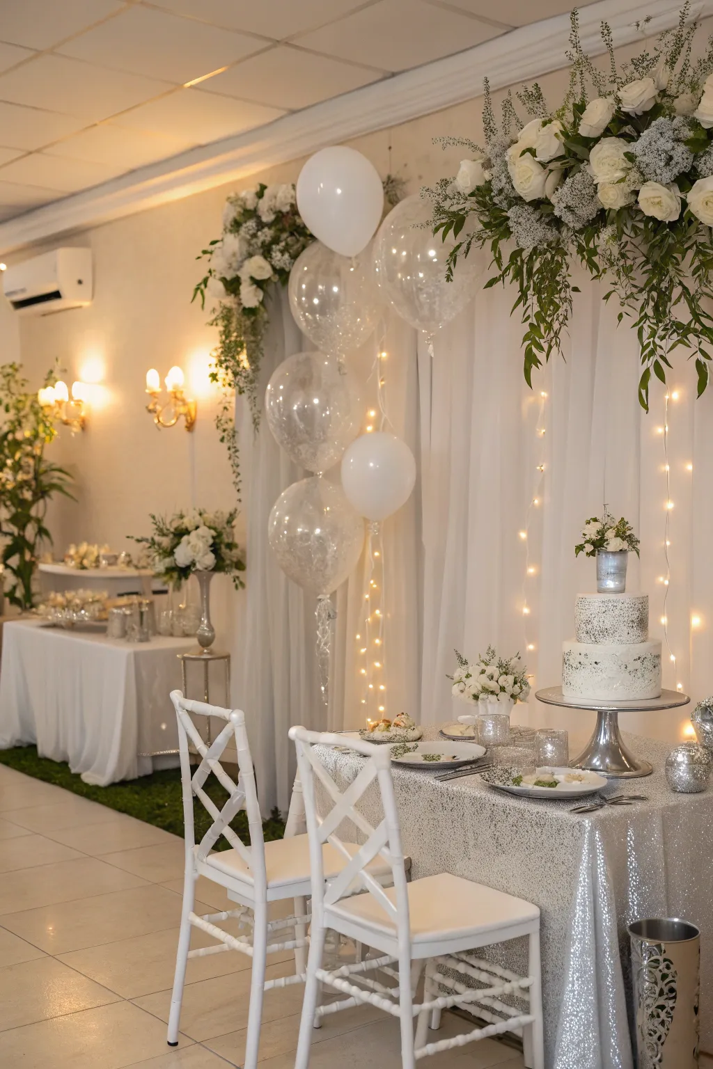Convert your venue into a snowflake dreamland using exquisite snowflakes and radiant silver highlights. I adore using pristine white fabrics to replicate the tranquil charm of a winter panorama.